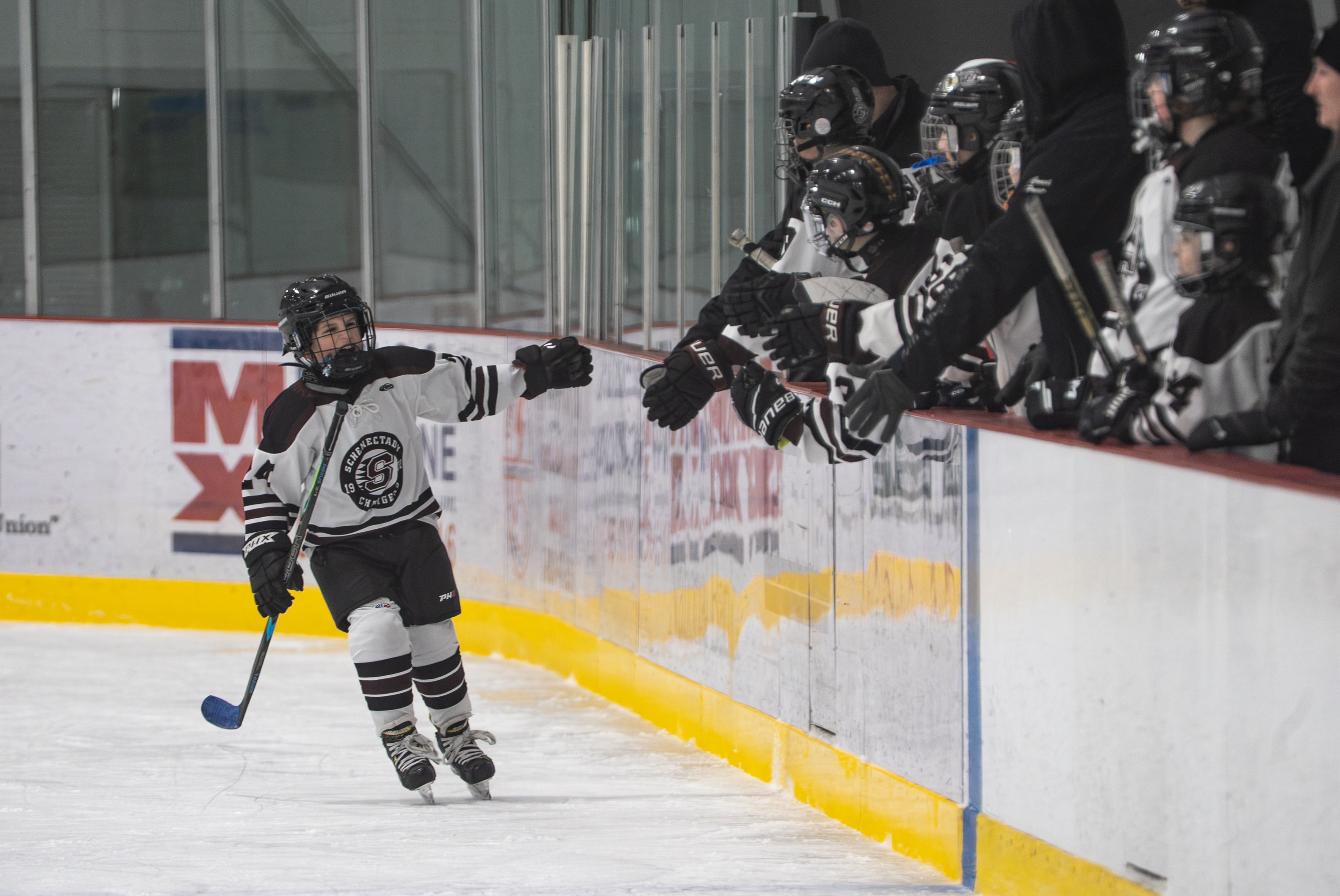 Schenectady Chargers forward Santino Girard celebrates a goal with his team during the bronze medal game on Feb. 8, 2026 at the Saranac Lake Civic Center in Saranac Lake, NY. (Isaac Williams/The Newhouse School)