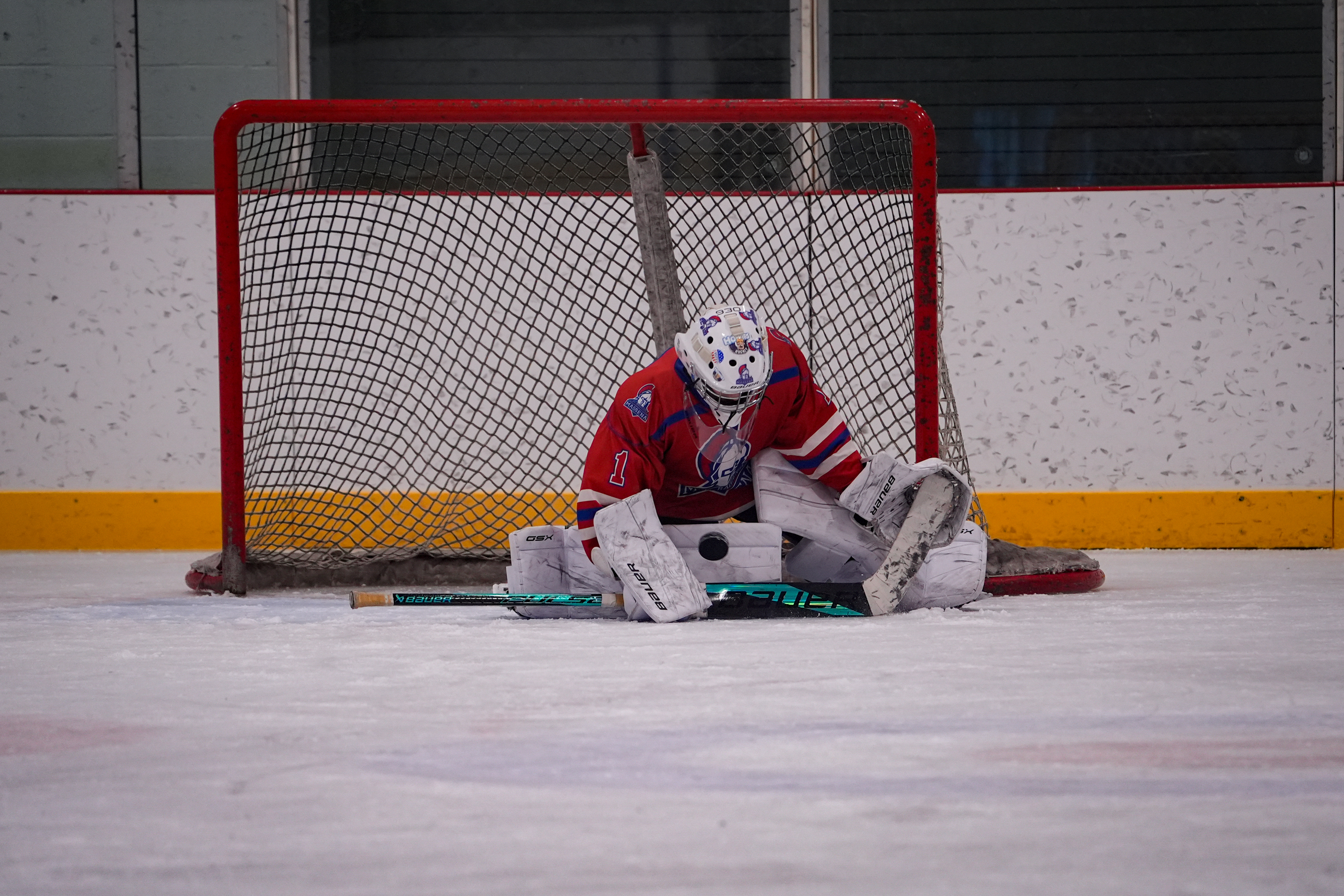 Massena Jr. Raiders goalie Mason Sienkiewycz blocks the puck against the Schenectady Chargers at the 2026 Empire State Winter Games at Saranac Lake Civic Center in Saranac Lake, New York, on Feb. 8, 2026. (Rebecca Beckas/The Newhouse School)