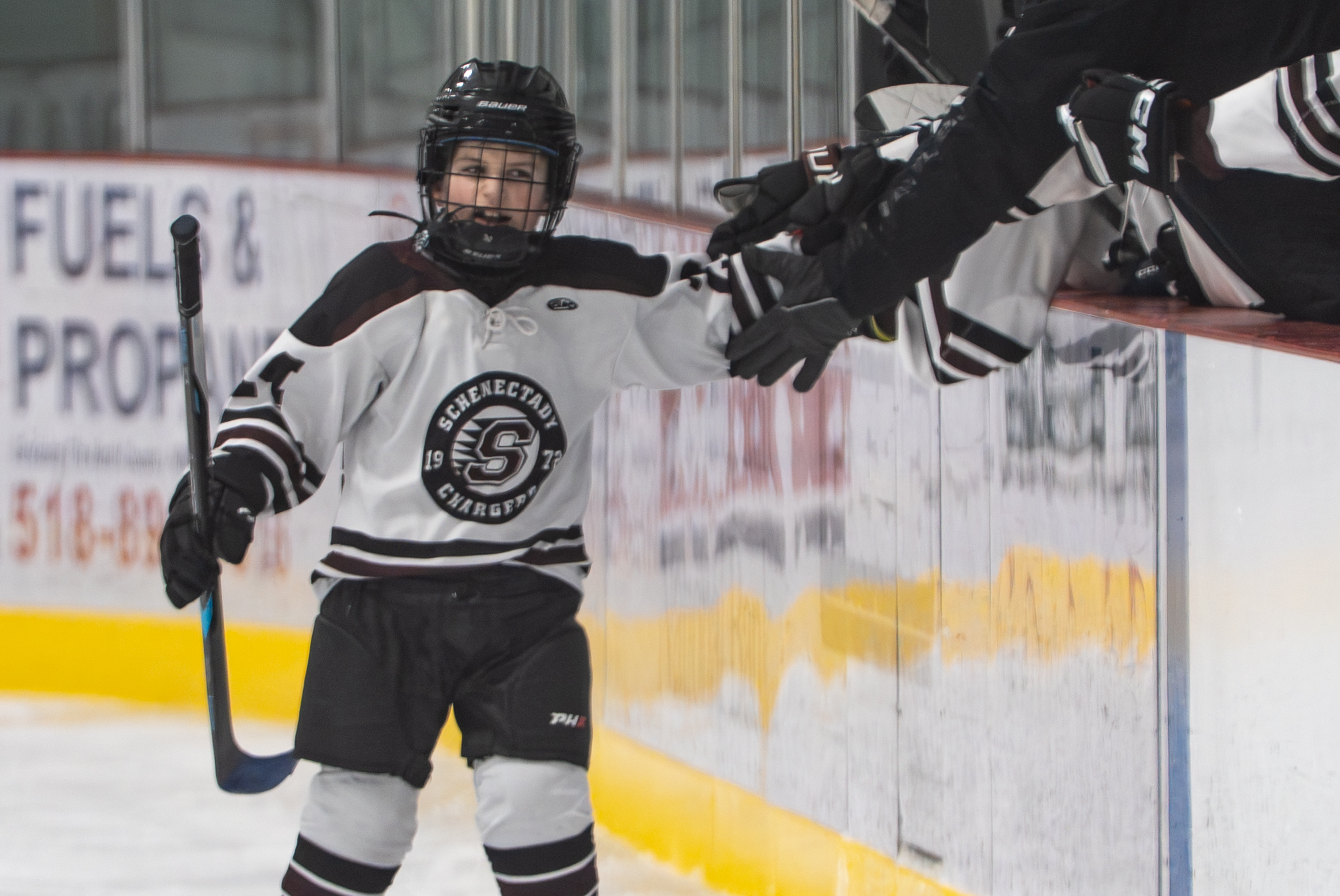 Schenectady Chargers forward Santino Girard celebrates a goal with his team during the bronze medal game on Feb. 8, 2026 at the Saranac Lake Civic Center in Saranac Lake, NY. (Isaac Williams/The Newhouse School)