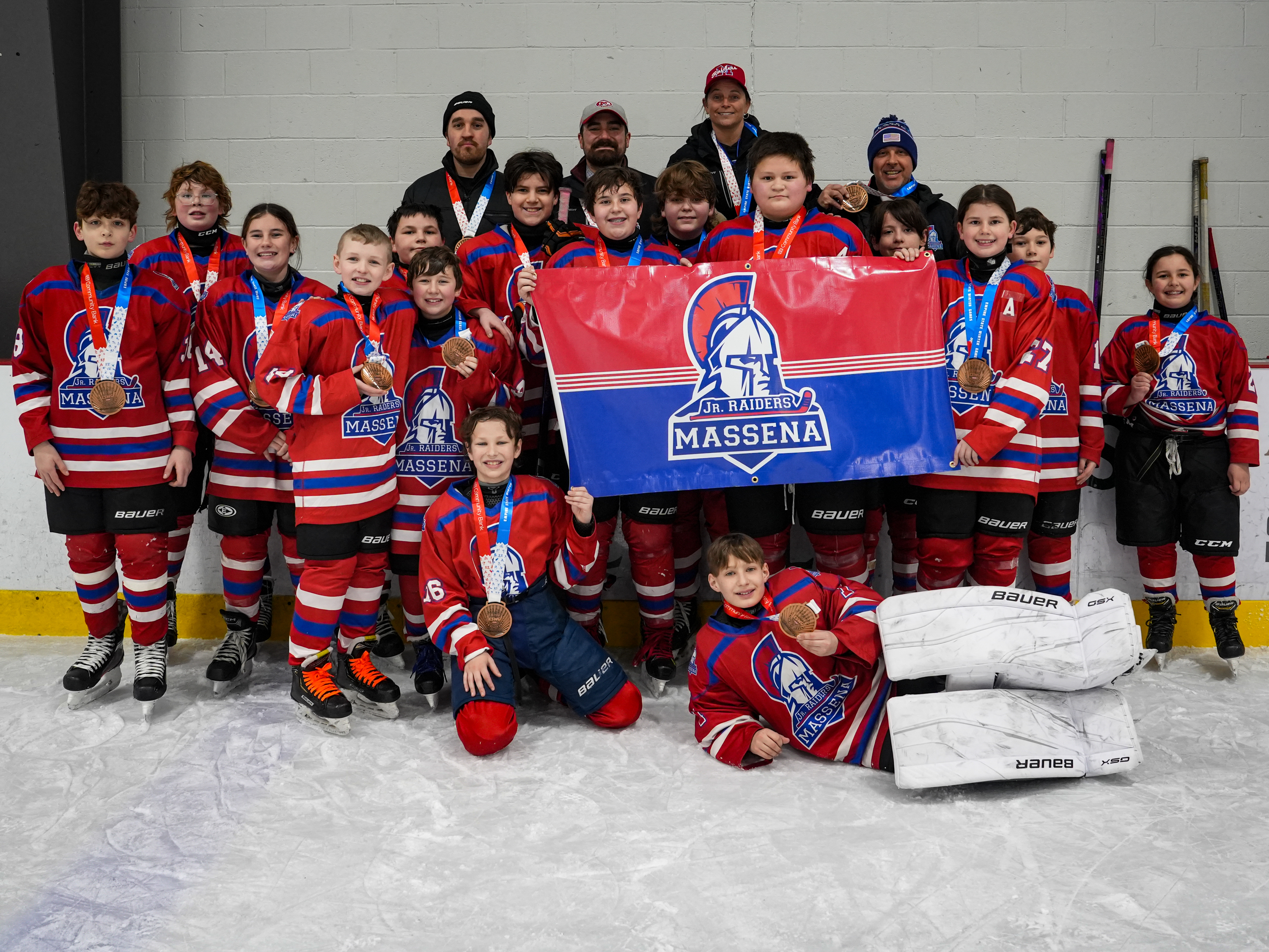 The Massena Jr. Raiders after winning the bronze medal at the 2026 Empire State Winter Games at Saranac Lake Civic Center in Saranac Lake, New York, on Feb 8, 2026. (Rebecca Beckas/The Newhouse School)