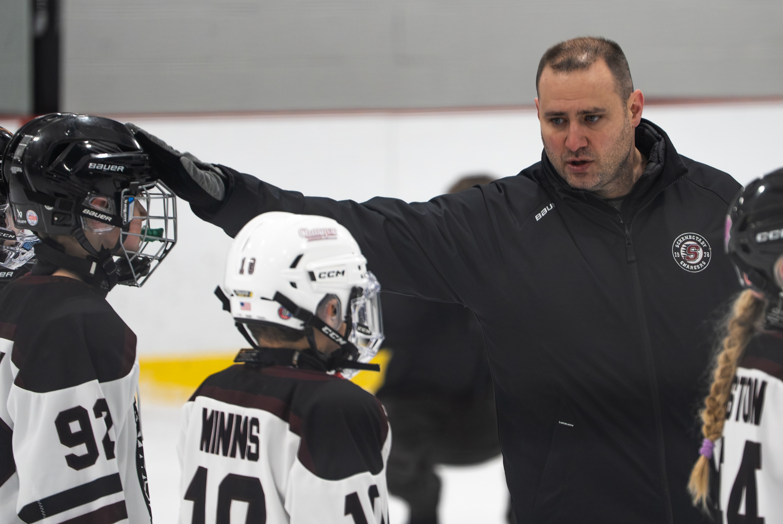 Massena Trojans coach consoles his players after their loss in the bronze medal game on Feb. 8, 2026 at the Saranac Lake Civic Center in Saranac Lake, NY. (Isaac Williams/The Newhouse School)