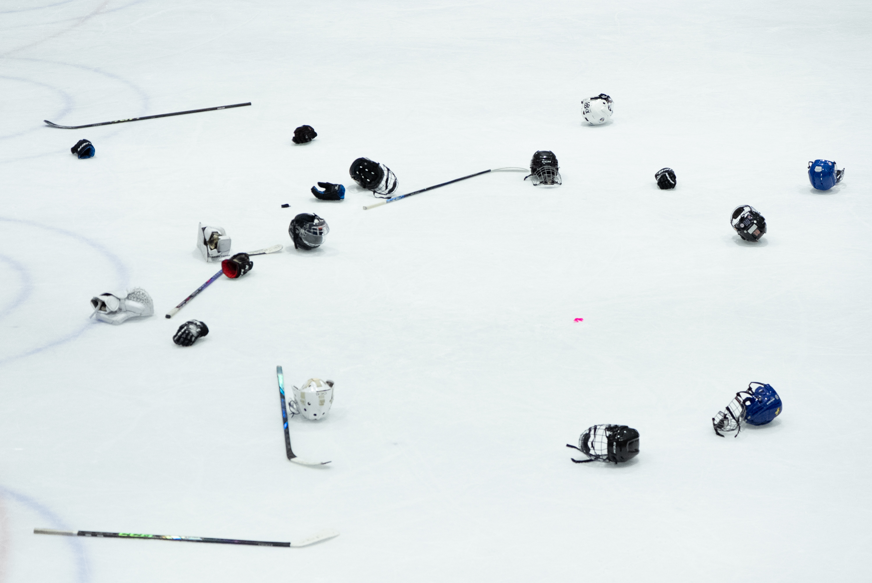 The 12U Red Watertown Wolves leave hockey gear behind post-championship win to shake hands with the New Hartford Spartans on the USA Rink during the Empire State Winter Games in Lake Placid, New York. Feb. 8, 2026.(Reed Granger/The Newhouse School)