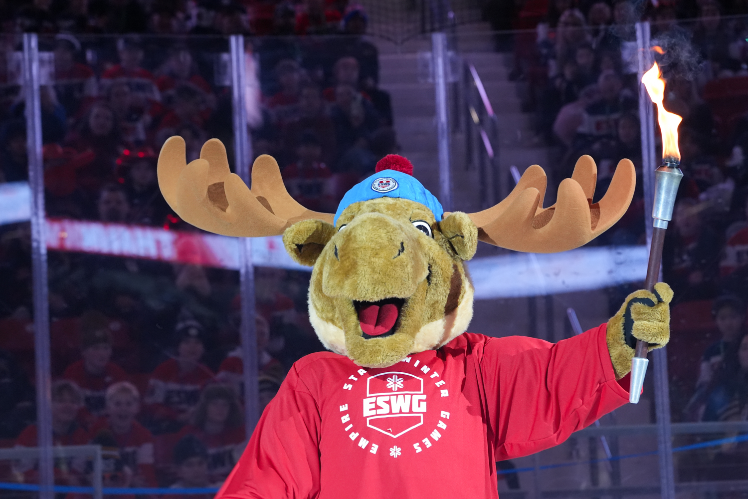Adirondack Mac carries the Empire State Winter Games Torch at the Opening Ceremony of the 2026 Empire State Winter Games at the 1980 Rink at the Olympic Complex in Lake Placid, New York, on Feb 5, 2026. (Adeline Taylor/The Newhouse School)