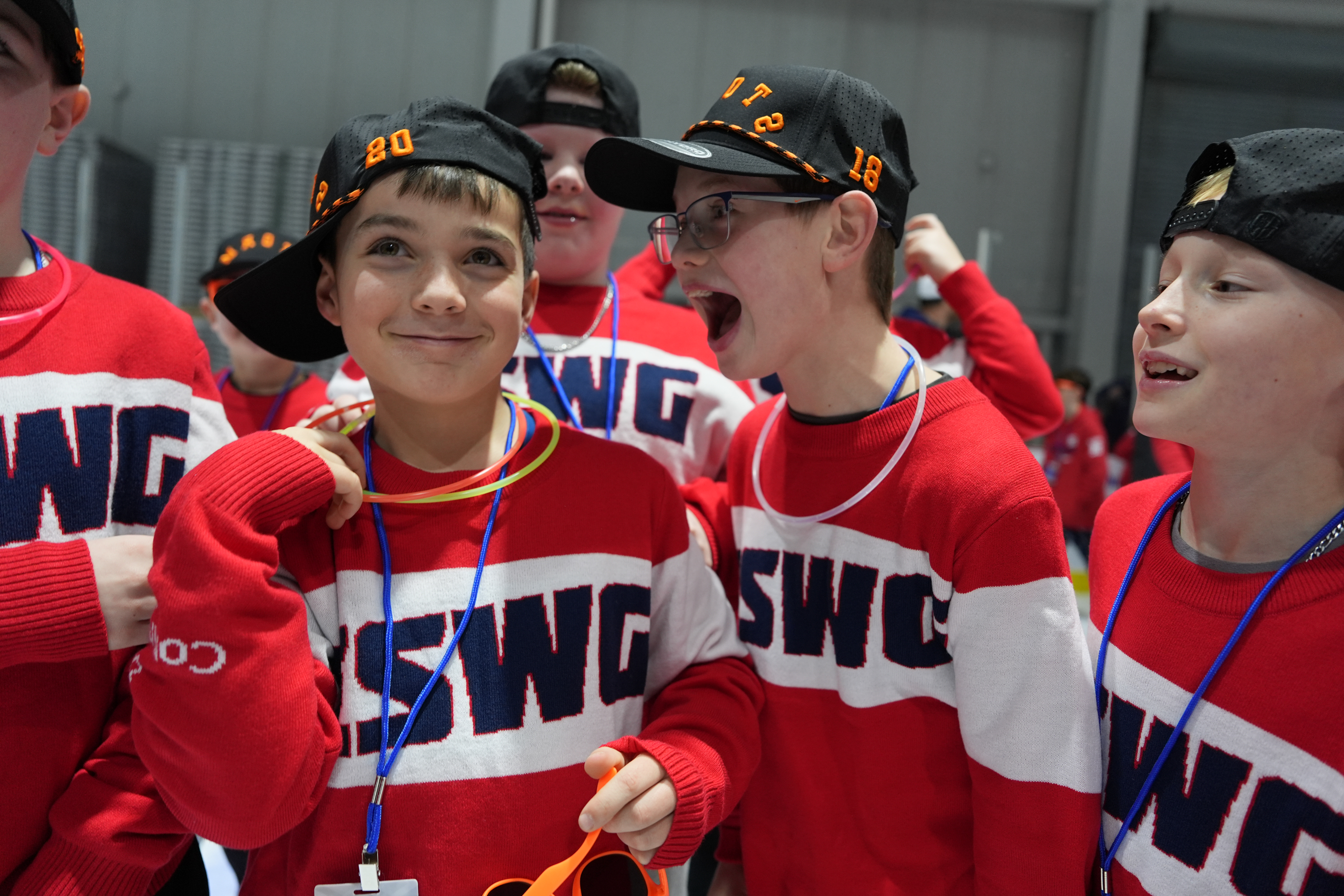 February 6, 2026Salmon River 10U Hockey's Hank Shickling laughs with teammate Leo Cortese before the Empire State Winter Games Opening Ceremony in Lake Placid, New York. February 5, 2026. (Reed Granger/The Newhouse School)