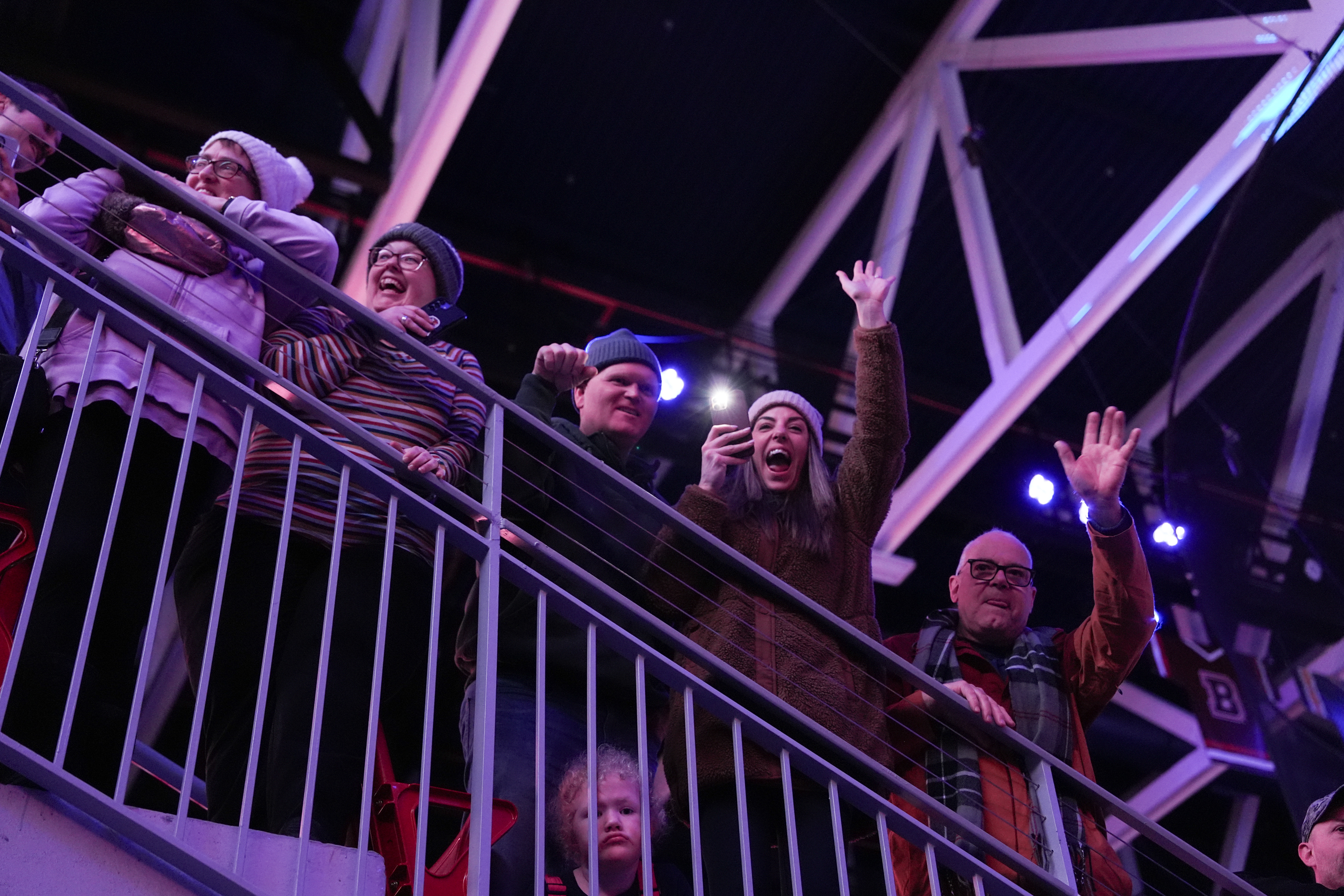 February 6, 2026Fans wave to athletes as they enter the 1980 Rink at the Empire State Winter Games Opening Ceremony in Lake Placid, New York. February 5, 2026. (Reed Granger/The Newhouse School)
