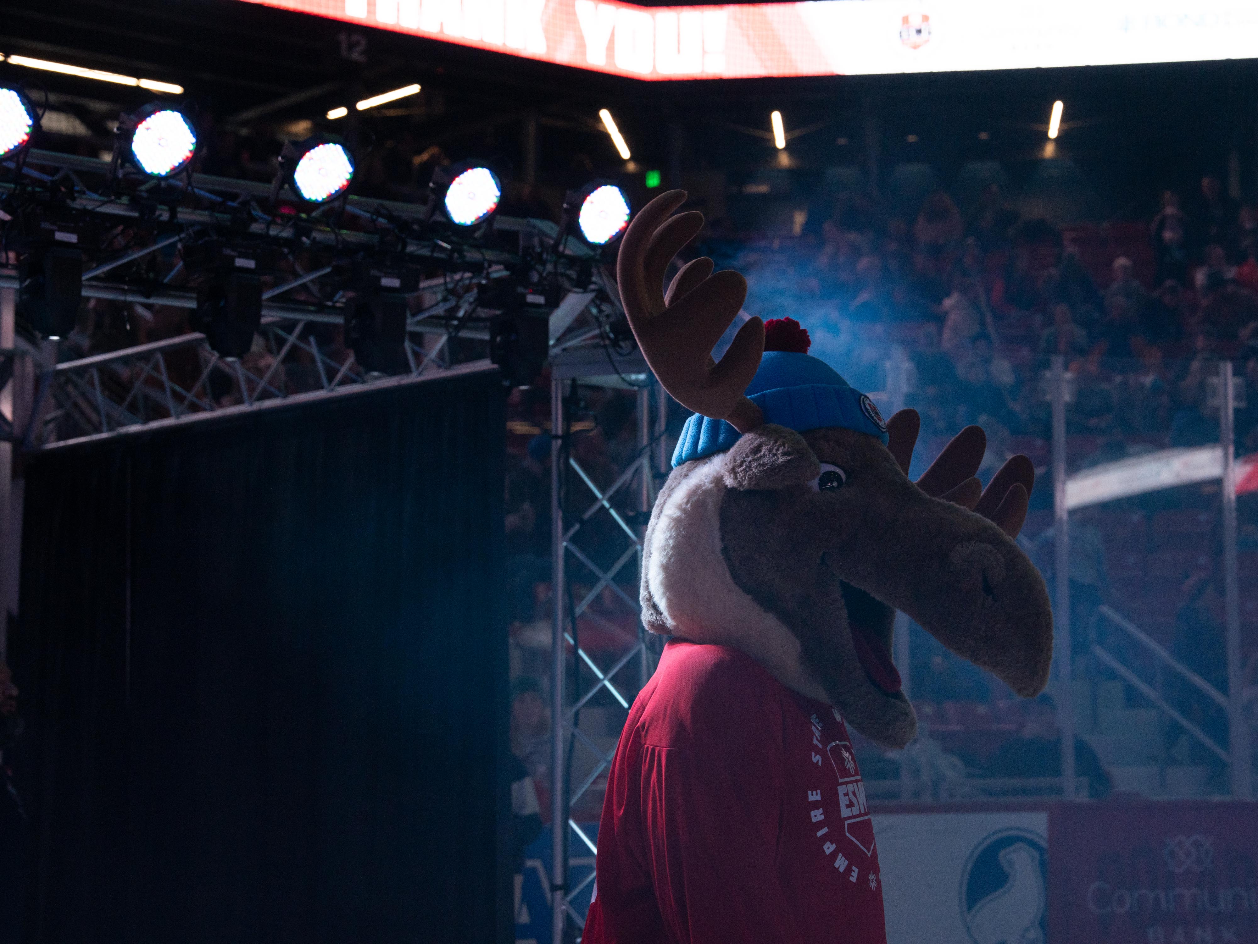 Mac the Moose appears at the 2026 Empire State Winter Games Opening Ceremony in the 1980 Rink at the Olympic Complex in Lake Placid, New York, on Feb. 5, 2025. (Rebecca Beckas / The Newhouse School)