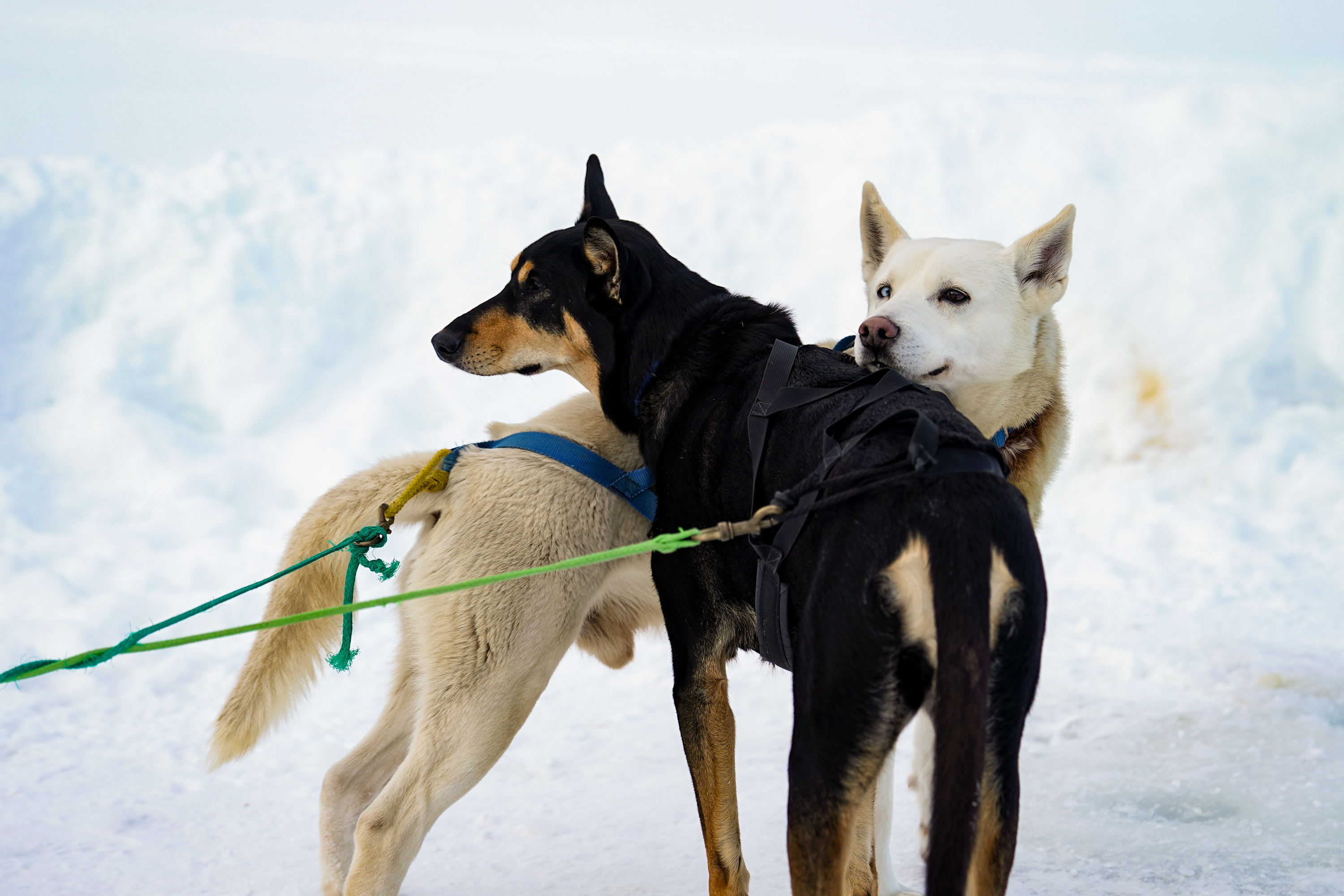 Sled dogs huddle together on Mirror Lake during the Empire State Winter Games in Lake Placid, New York on Friday, Feb. 6. (Jack Henry / Newhouse School)