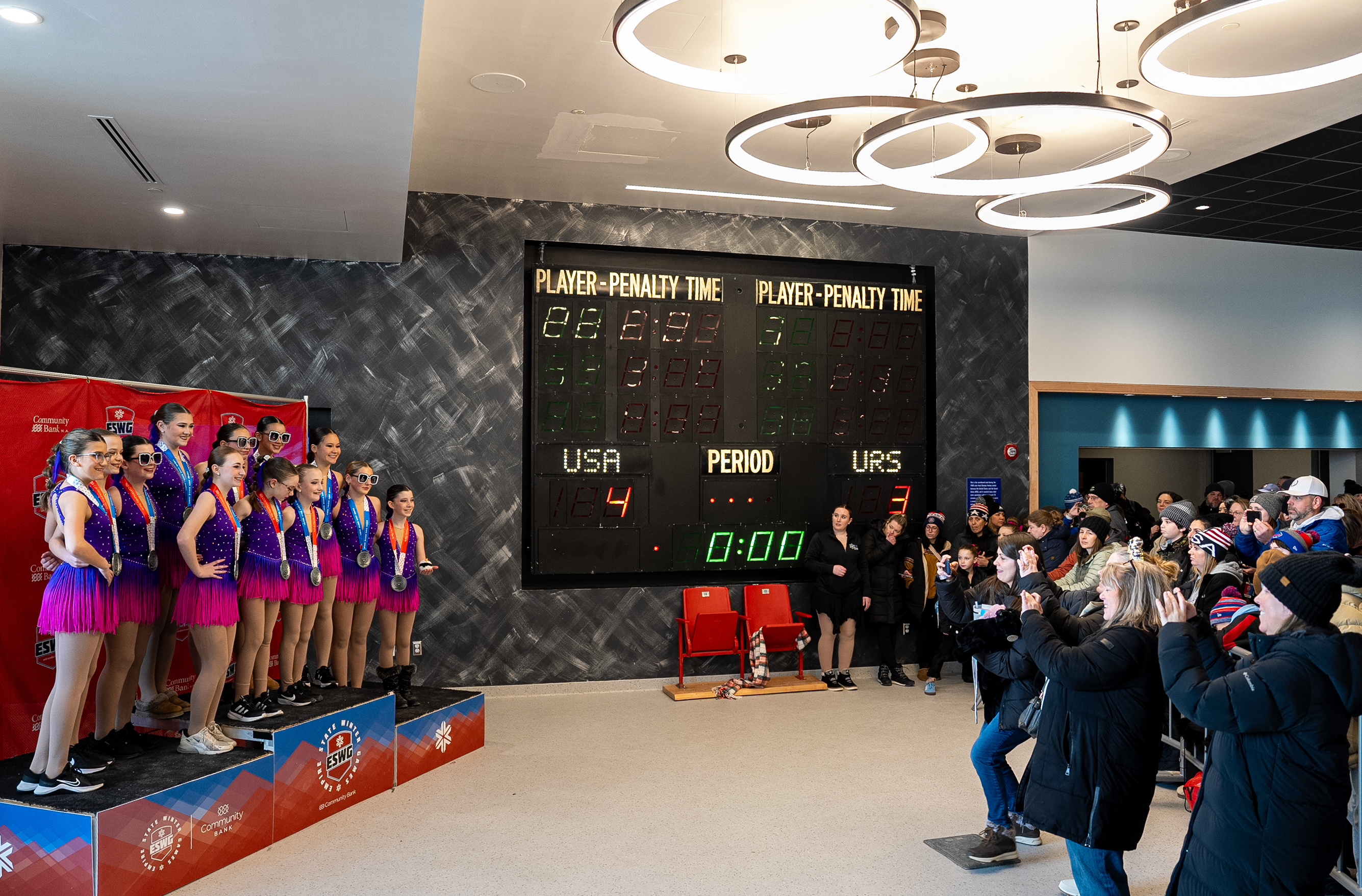 Synchronized skating team poses on the podium after getting their silver medal at The Olympic Center in Lake Placid, N.Y. at the Empire State Winter Games on Sunday, Feb. 8. (Sky Zhuang/The Newhouse School)