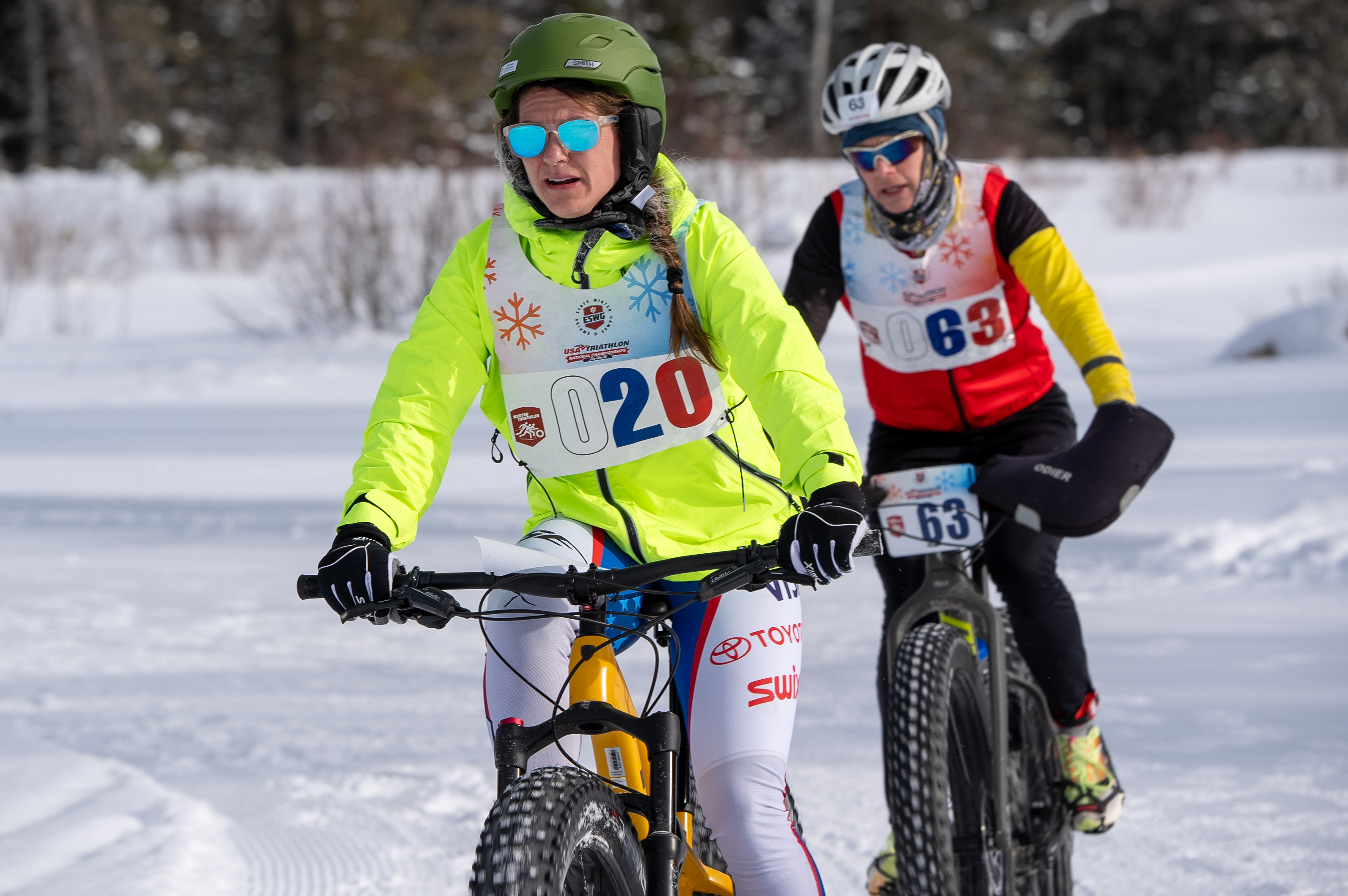 February 7, 2026Kristie Morton (left) and Ginger Reiner (right) at Mount Van Hoevenberg in Lake Placid, New York, during the 2026 USA Winter Triathlon Championship. (Photo by Sky Zhuang/The Newhouse School)