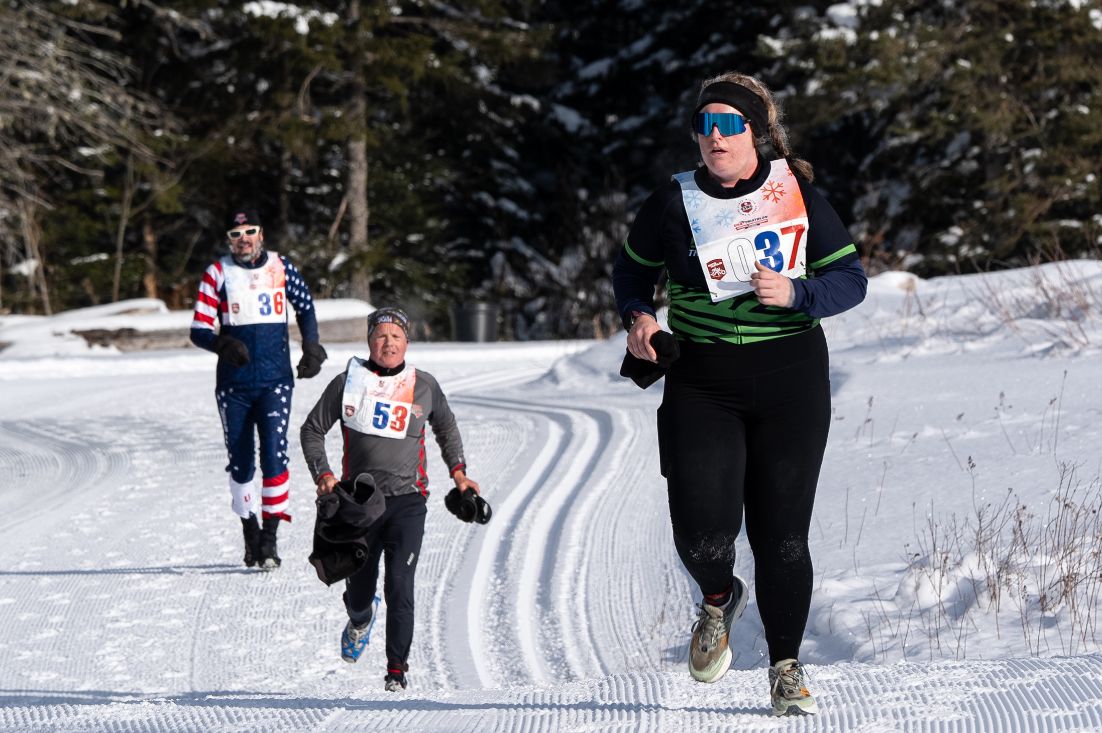 February 7, 2026Edward Wheeler (left), Ted Hibben (middle), and Lindsey Wilcox (right) at Mount Van Hoevenberg in Lake Placid, New York, during the 2026 USA Winter Triathlon Championship. (Photo by Sky Zhuang/The Newhouse School)