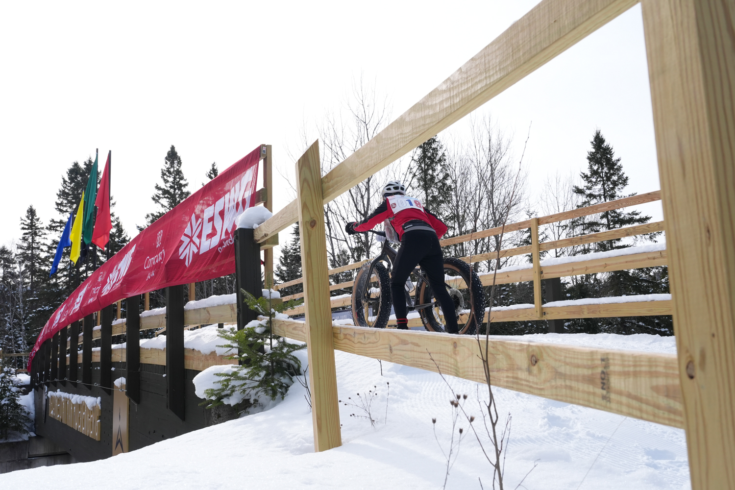 February 6, 2026Suzanne Mink, 73, pushes her bike across a bridge in the bike course at the 2026 USA Winter Triathlon National Championships at the Empire State Winter Games at Mount Van Hoevenberg on Feb 6, 2026. (Adeline Taylor/The Newhouse School)