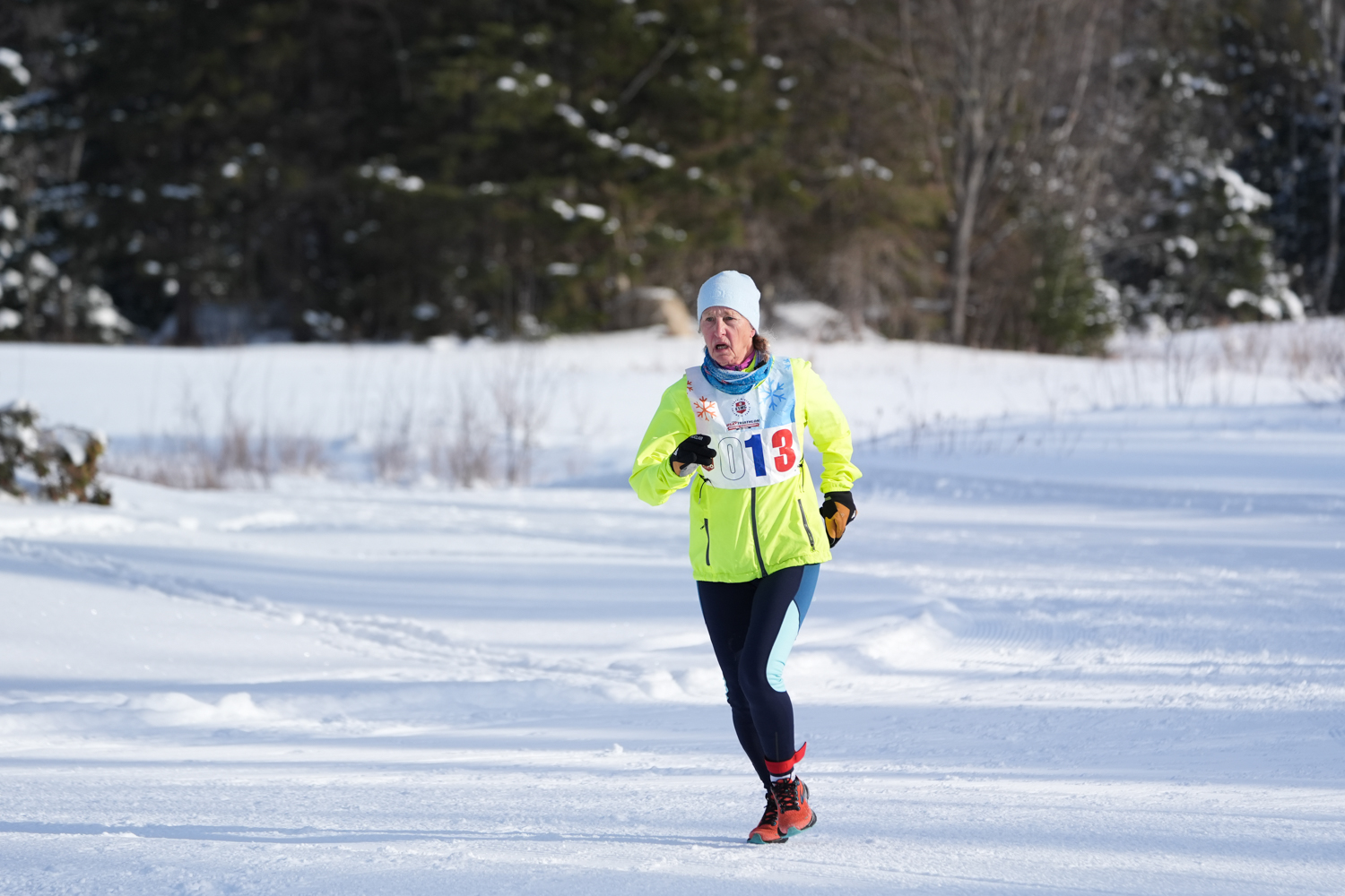 Ingrid Gard, 68, competes in the running portion of the 2026 USA Winter Triathlon National Championships at the Empire State Winter Games at Mount Van Hovenberg on Feb 6, 2026. (Adeline Taylor/The Newhouse School)