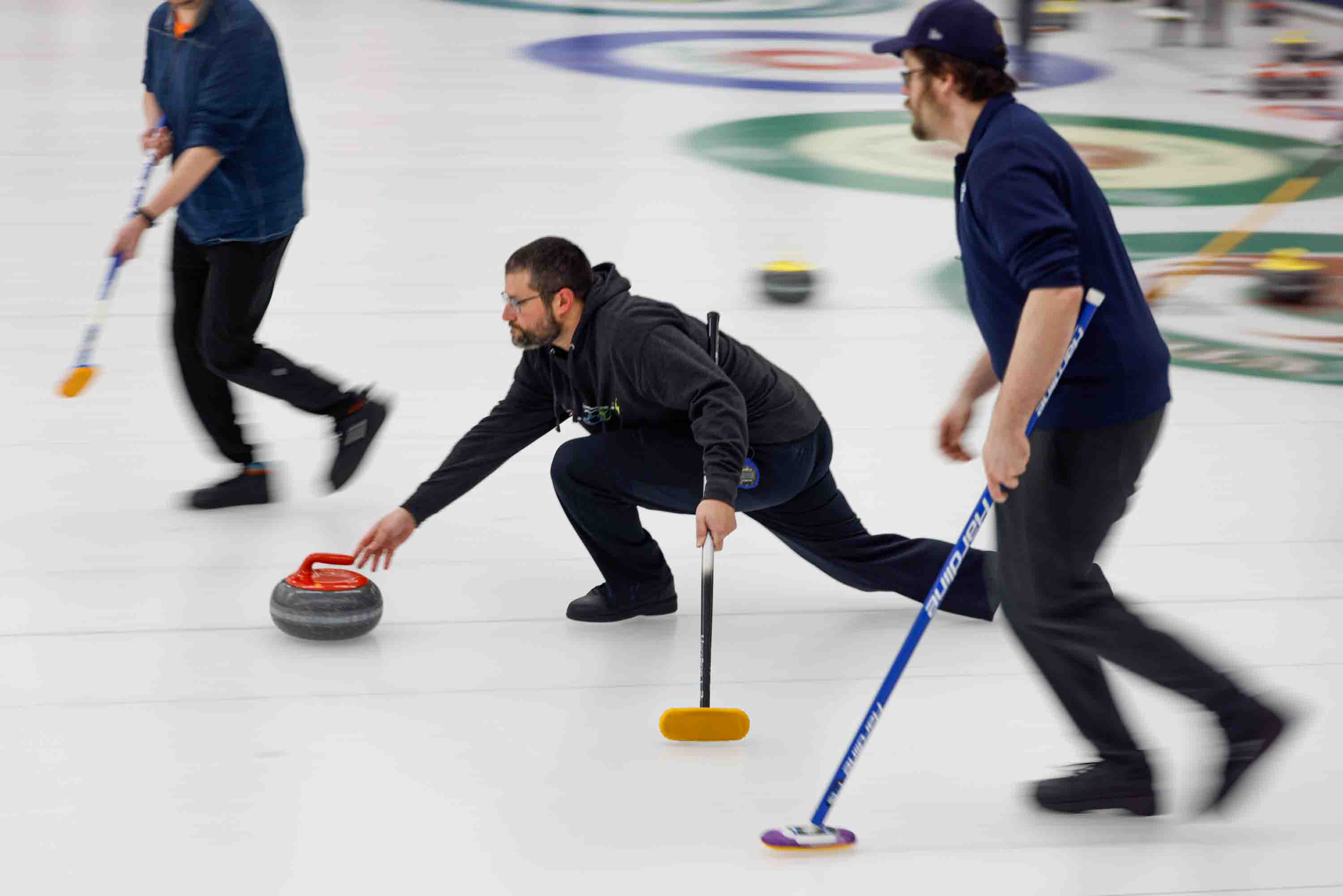 February 2, 2026The Empire State Winter Games curling finals took place on Sunday, Febuary, 1, 2026 at the Utica Curling Club. Player captured sliding the rock down towards the target.
